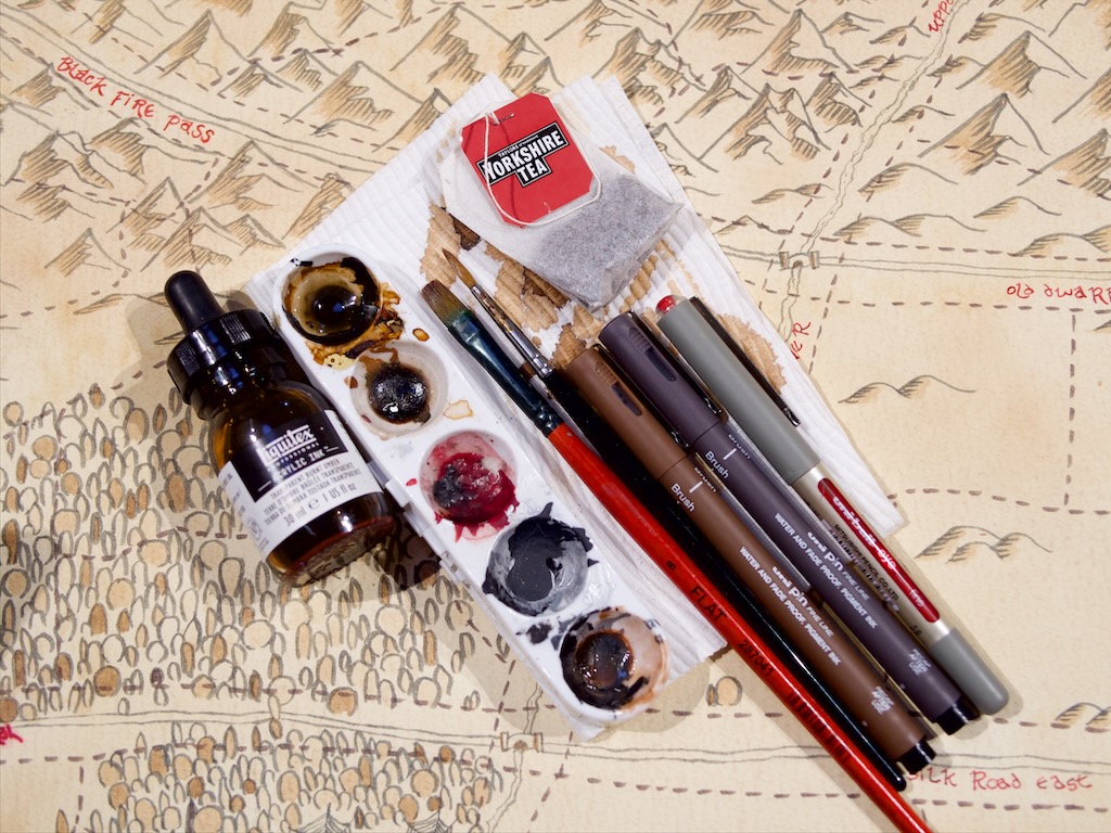 I tried to keep an eye on where the original map had place location names to make sure I left space for them. I made a few mistakes there and decided to write place names before drawing detail to avoid doing that again! I initially used a permanent marker to write location names, but that ended up bleeding in the paper a bit and generally looking a bit icky so I switched over to the red Uniball pen you see in the tools photo.