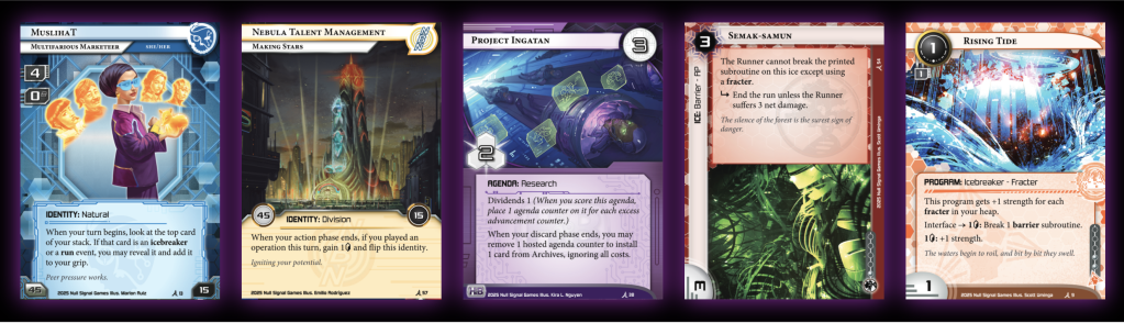 I’ve covered this mostly in the opening paragraph, but in games of Netrunner one player takes on the role of the Runner and the other the role of the Corp. The Wizards version of the game was set in the Cyberpunk 2020 universe, while the Fantasy Flight Games (FFG) redo was set in FFG’s Android cyberpunk setting. The Null Signal Games version continues the story from the FFG game, although presumably as fan content rather than officially.