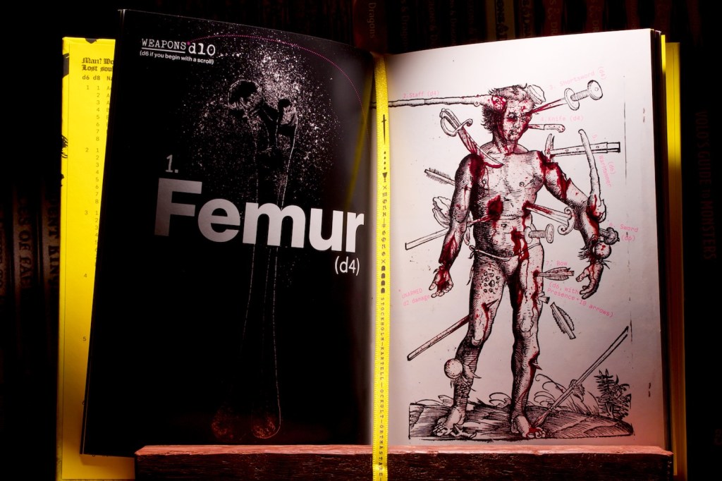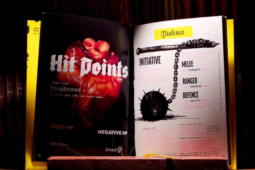 The crazy graphic design is pretty interesting, on the one hand it does a great job of communicating the feel of the game, but possibly more importantly it does a good job of making different sections easy to find. I read an article on this book that discussed that as each page looks different, you end up using the art/text as a landmark when flicking through the book, and I very much agree with that. The book also has the index on the rear inside cover which is a genius move that makes it very easy to consult at a moment’s notice.