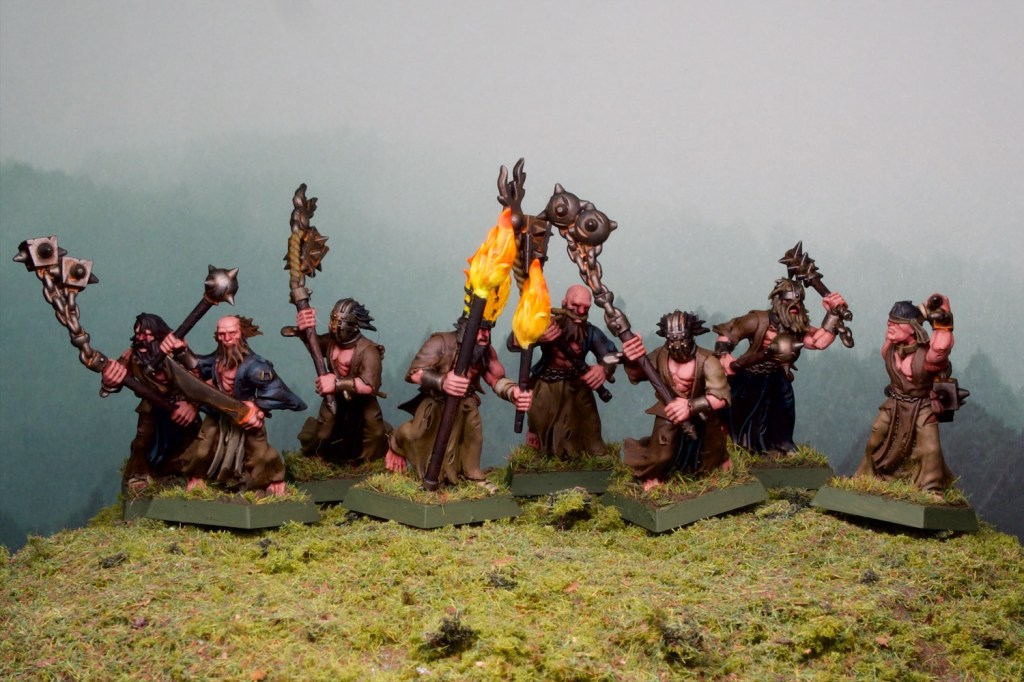 There’s not too much to discuss painting-wise, these are your bog standard doom saying, apocalypse preaching, world is ending types, in their usual accoutrements: brown and black rags! I tried to break up the mass of rags with some different shades of brown (I think I have 3 all up), as well as the aforementioned black sections. The fire was fun to paint, with some wet blended yellows and oranges over an off-white base coat.
