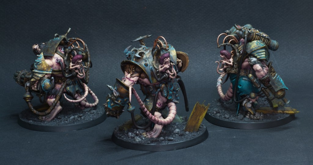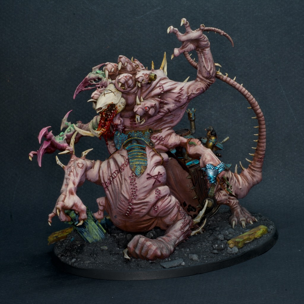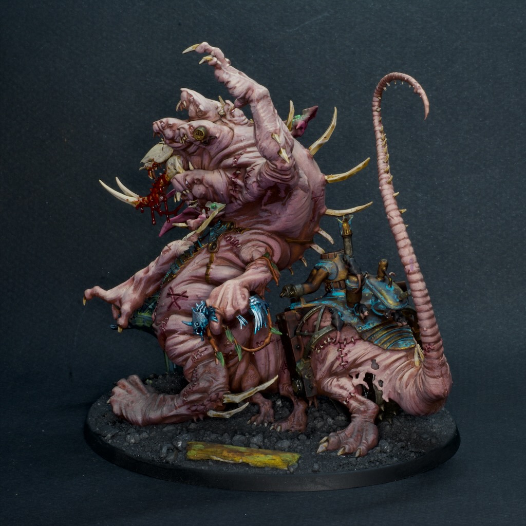 I recently acquired another glass cabinet a little larger than my existing ones to display some of my bigger projects all in one place. One of the armies that was placed within was the Skaven I’ve been working on for a little bit. There are only a handful of models left to “finish” that army and seeing them in their grey plastic next to the rest of the painted models motivated me to make some more progress. So behold in all its gruesome glory, the (extremely appropriately named) hell pit abomination.