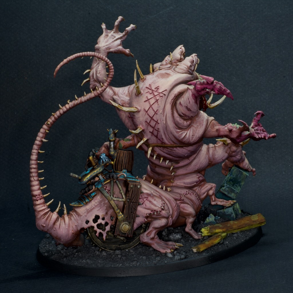 What a fun model, absolutely covered in details and generally very abominable. It’s been a while since I painted a large monster, let alone an almost entirely flesh coloured one. It was a challenge to keep that much skin visually interesting without going a bit mad painting it all.