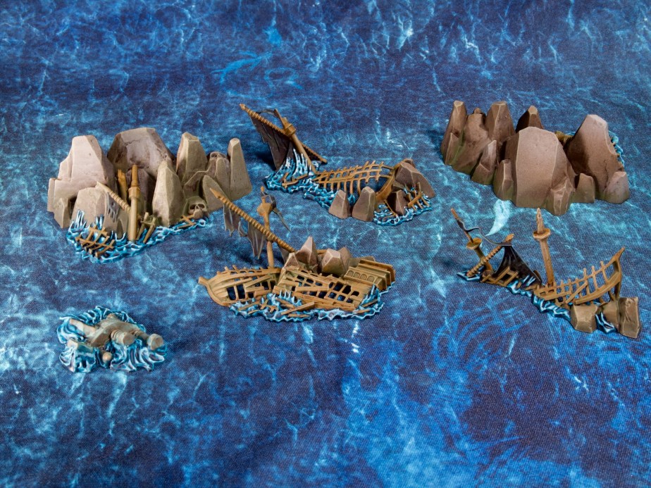 Rather than paint more ships, this time I decided to tackle the terrain pieces in the box. These are nicely varied and hold a ton of detail given the scale they’re representing. They also had the advantage of being mostly rocks and therefore were nice and quick to paint, which fit my purposes perfectly.
