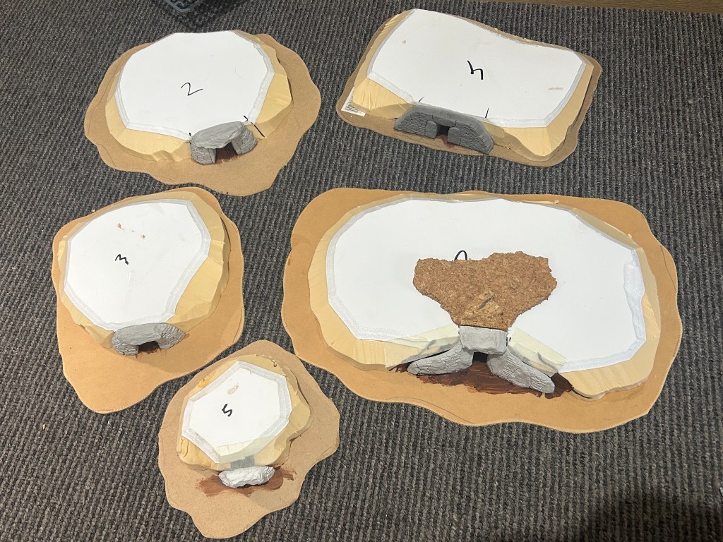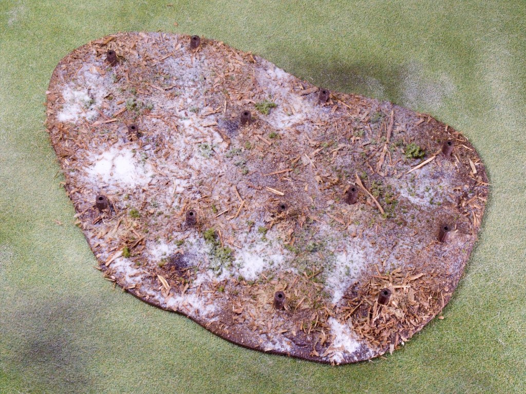 I made a very rough trunk shape in tinkercad and 3D printed the 60 I needed. I then glued them down in a semi-random pattern to some MDF bases I cut out of the back of an old bookshelf (never throw anything away!), and was ready for basing.
