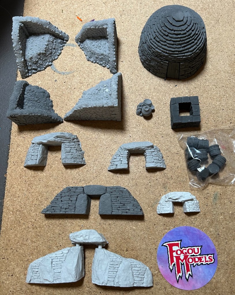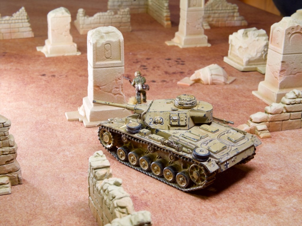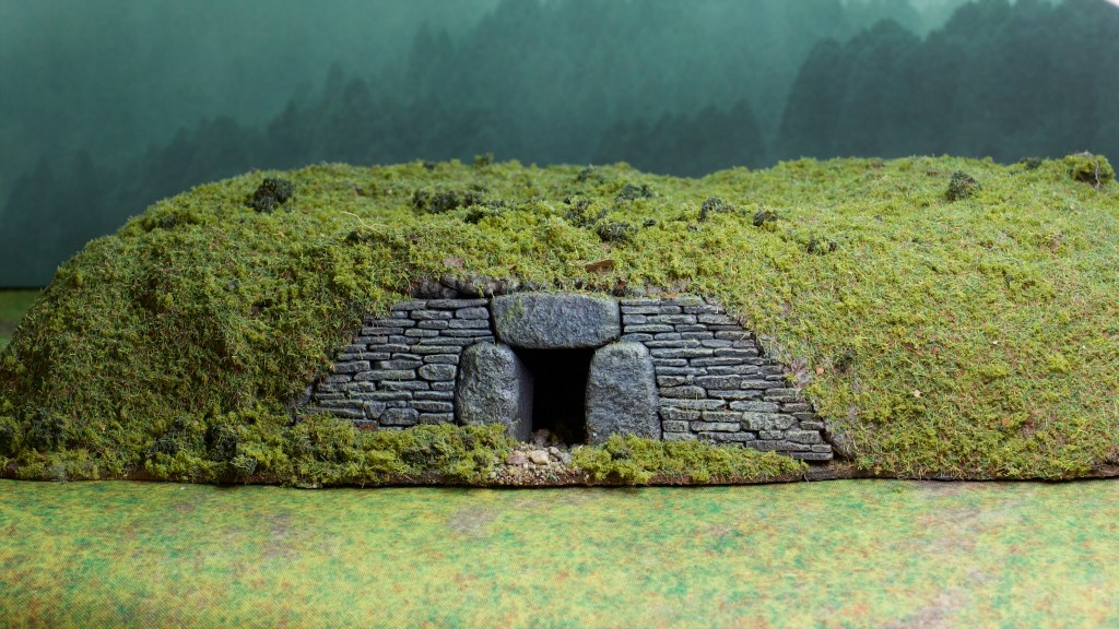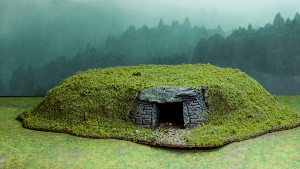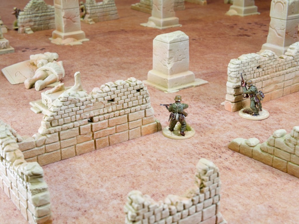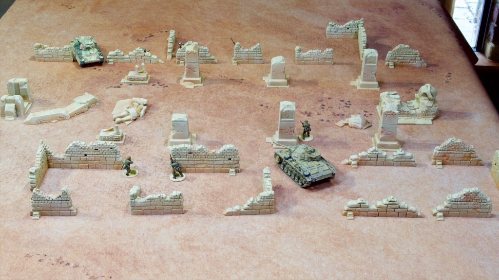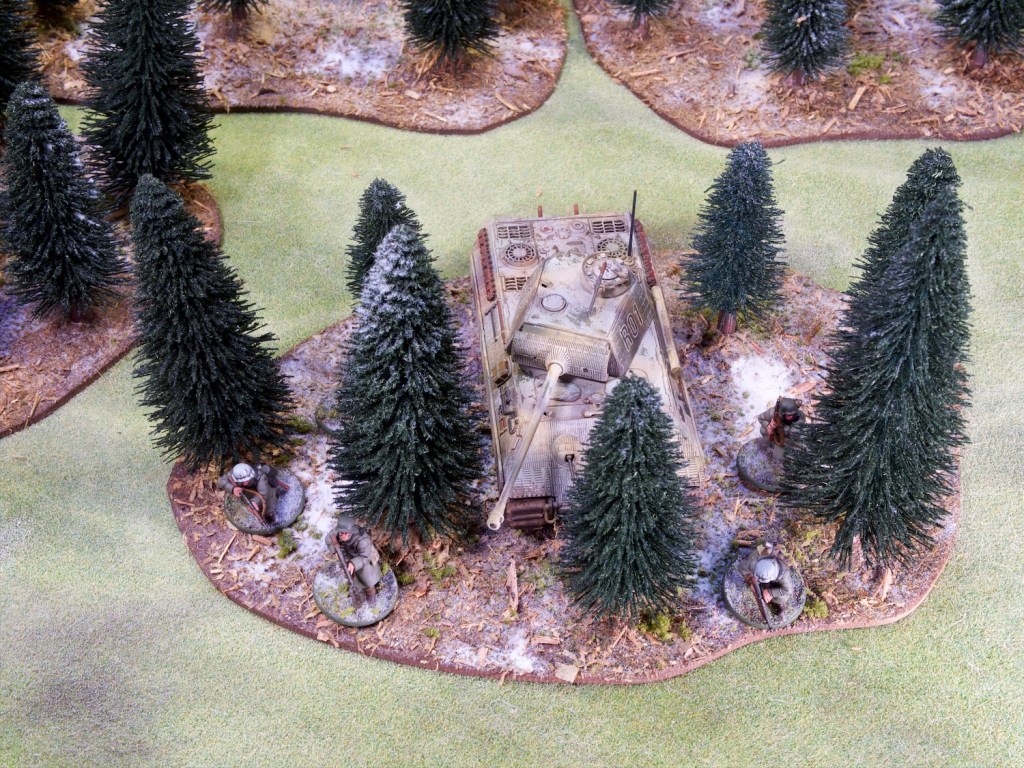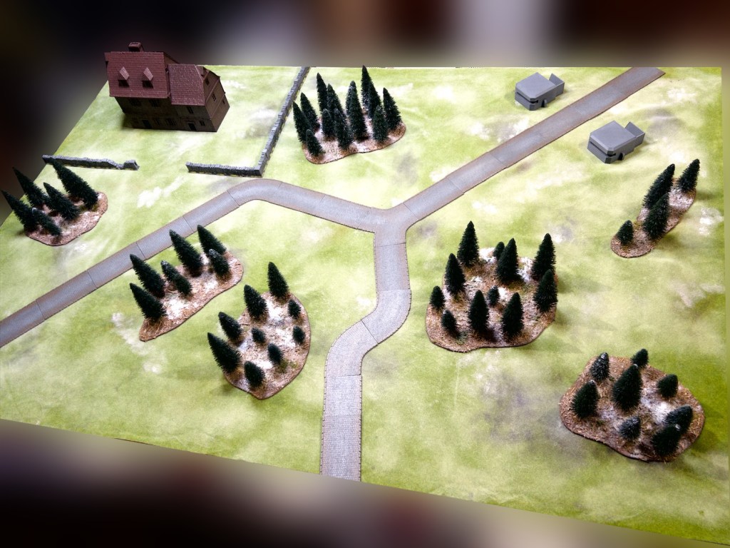 I wanted the table to have a frosty morning with some light snow look rather than a full on snow storm, hence the light use of snow flock on the forests and the light dusting of white on the mat. I’m hoping to communicate the cold through the mat and the tree stands only, allowing me to place terrain pieces I painted for my other settings over it and having them not look out of place. For example I’m planning on using the cobblestone road I painted for my Normandy games in this game as you can see above.