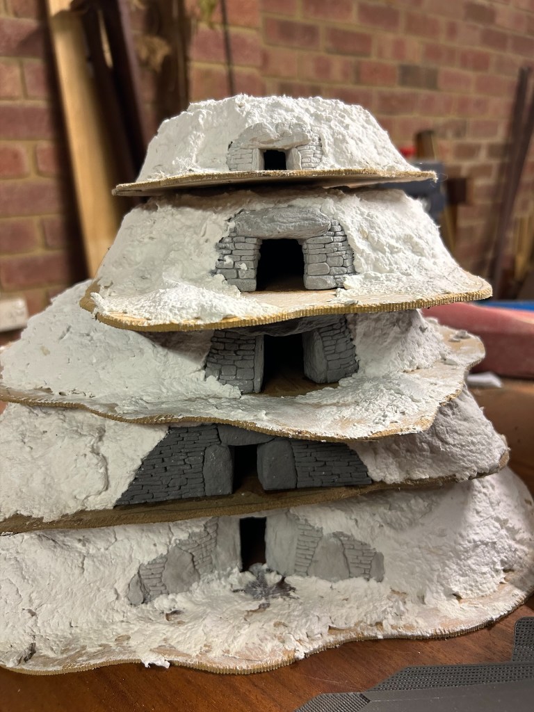 The trees you see above were cheap ones from Amazon which came in big batches with some variety in sizes which was quite nice. 60 of them cost me just below $60 (Australian dollars that is!) which seemed like a nice rate. They are a basic shaped and flocked bottlebrush style pine trees, nothing fancy but they do the trick. The flock was not glued on great but I knew I was going to spray them with varnish to get some snow on there too so was not too worried. The “trunks” of the trees were bare wire twists so I needed to make some holders for them, to make the trees more realistic and allow them to be removed for gaming and storage purposes.