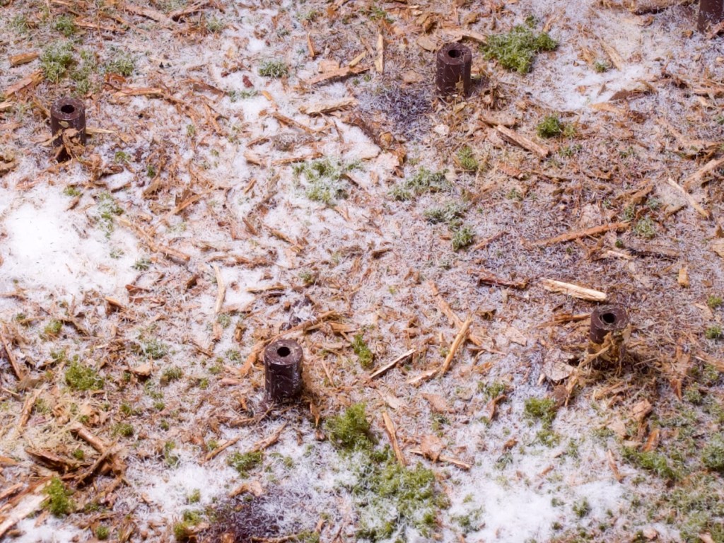 I wanted a forest floor look but wanted to stay away from a leafy look as befits a pine forest. As a result while I went my usual route of blending up some leaf litter as I did for these citadel woods and for my endor table I stayed away from soft leaves (european style!) and went for dried eucalyptus leaves which are much harder and blend down to a powder. That mixed with small twigs gave a nice finish that I think does a decent job of impersonating dropped branches and bark at the scale.
