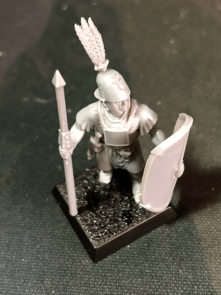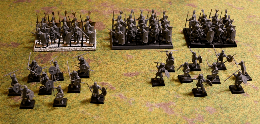 To respect the ratio of Hastati to Principes to Triarii found in each maniple (120, 120, and 60 men strong respectively), the republican army list sets a rule that a ratio of 2:2:1 units must be taken. I decided that these 5 units plus some skirmishers would make a good maniple/division. The game treats the components of a maniple as small units (so half the size of standard units), and sets as a guide the frontage of small units to 80-120mm (so 4-6x20mm based models in the first rank). If two of these small units are to match the 120 men found in the historical formation, then choosing the smaller end of that range gives me a 4×2 formation, 8 men per unit, 16 hastati per maniple, or a ratio of one miniature per 7.5 men, which seems reasonable to me (I’ve seen 10 used in the past). Now enough of that, let’s talk about painting!