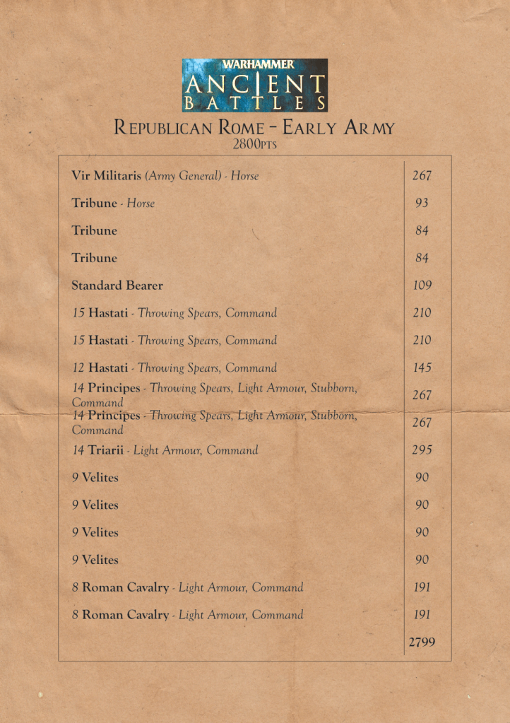 Some of you may remember a post from a while back about my Republican Romans army. At the time I had built a fair few models and spent some time deciding how to field them using the Warhammer Ancient Battles ruleset. They’ve been sitting in a box since then waiting for motivation to strike. A couple of weeks ago I found a second hand copy of the rulebook and army list book for the Hail Caesar game by Rick Priestley at a local game store. I bought them, started reading them, and immediately began planning lists for my Romans using the ruleset.
