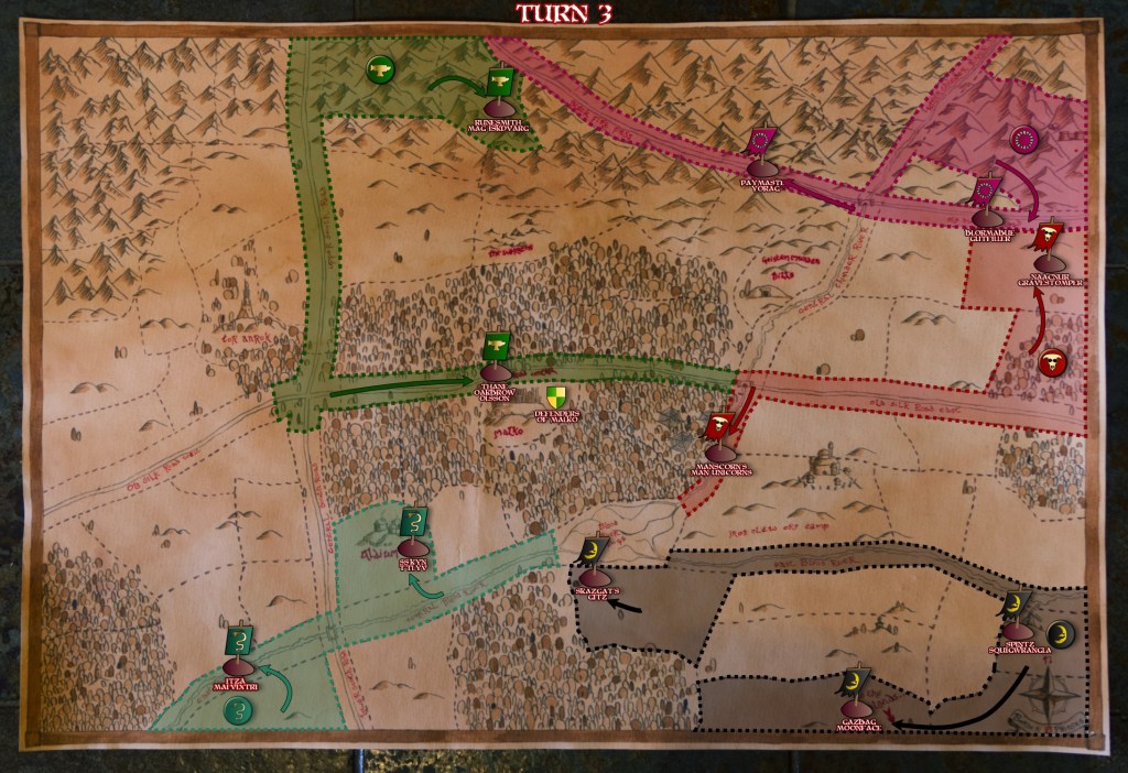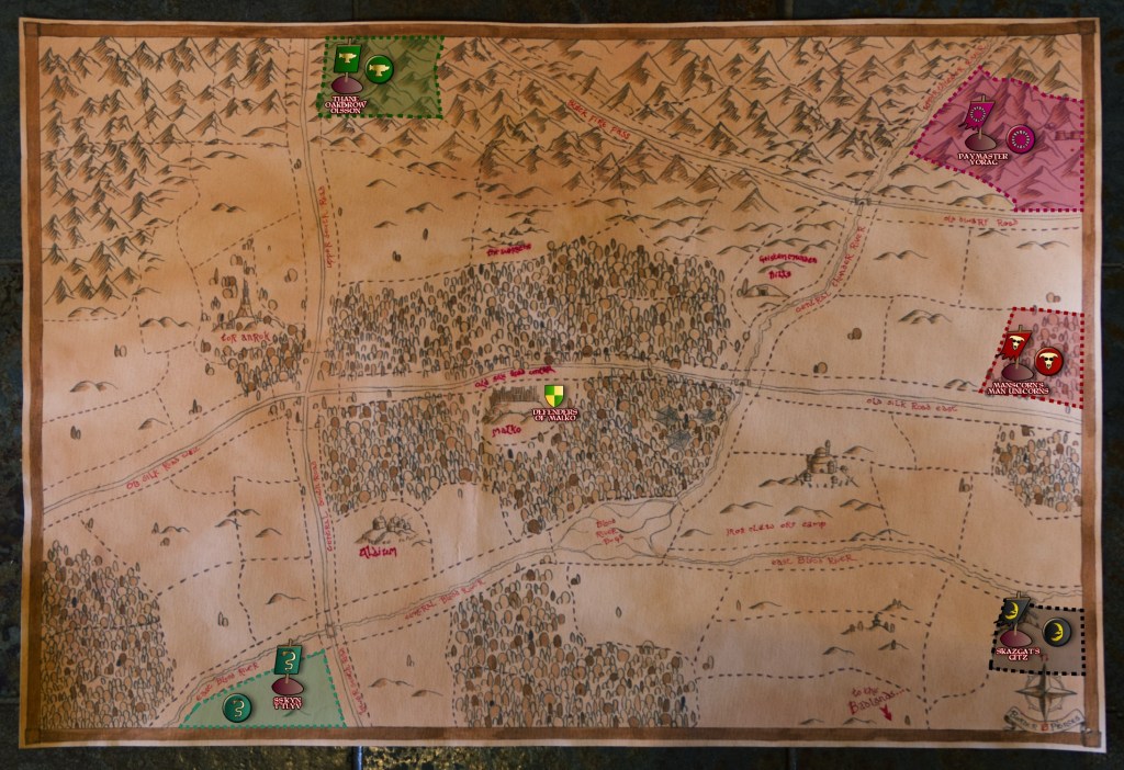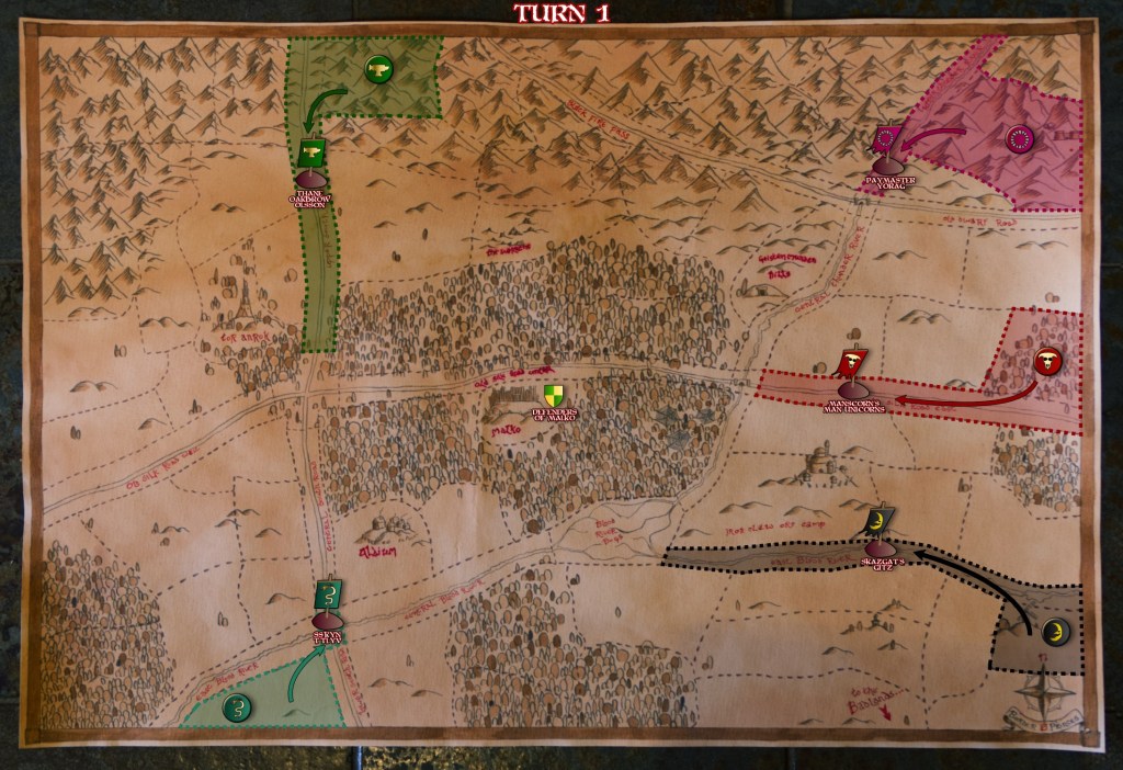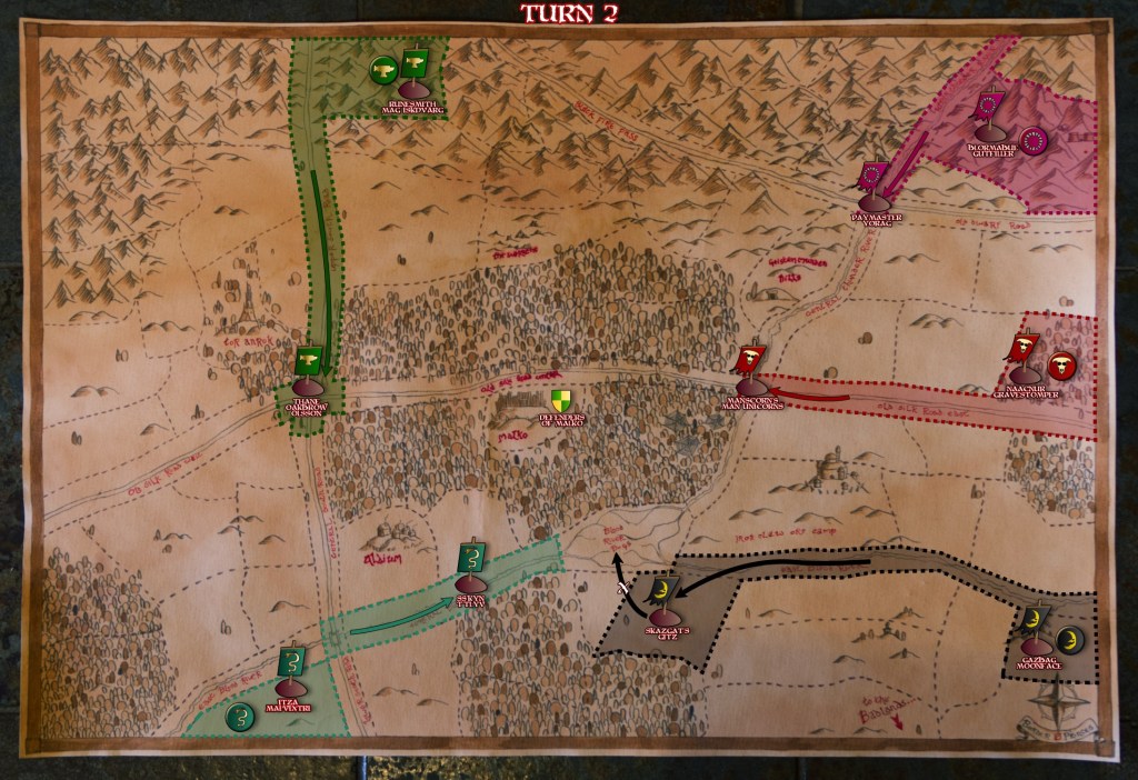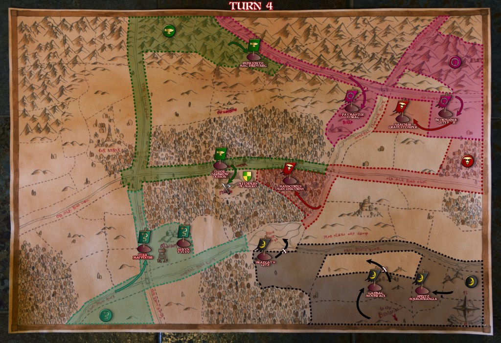 The scenario I set up was as follows: the Skaven and Undead armies needed to hold onto a warpstone meteor while the Dwarf/Bretonnian alliance needed to get them clear of it. To spice things up some, I placed four isolated trees on the board (i.e. not on the forest bases), and after turn one revealed them to actually be treemen who were generally opposed to the idea of big battles being fought in their forests and went after whatever unit was closest. Despite this extra chaos the game was extremely close and ended with both sides within a single reputation point of each other (reputation tracks your force morale, if it’s at or below 0 at the end of the turn, you lose the game). The Skaven/Undead forces won the day, but it really could have gone either way.
