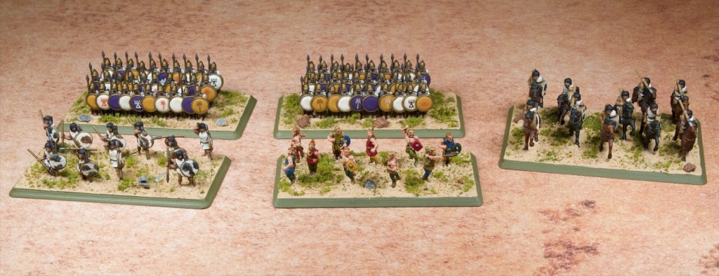 Here they are amongst the other bases I painted so far. I really like the distinction between skirmishers and ranked infantry you get at this scale. I’ve made a small dent in the Carthaginian Division set now, with roughly a third of the units painted (the rest is mostly a lot of Gauls and Iberians!).