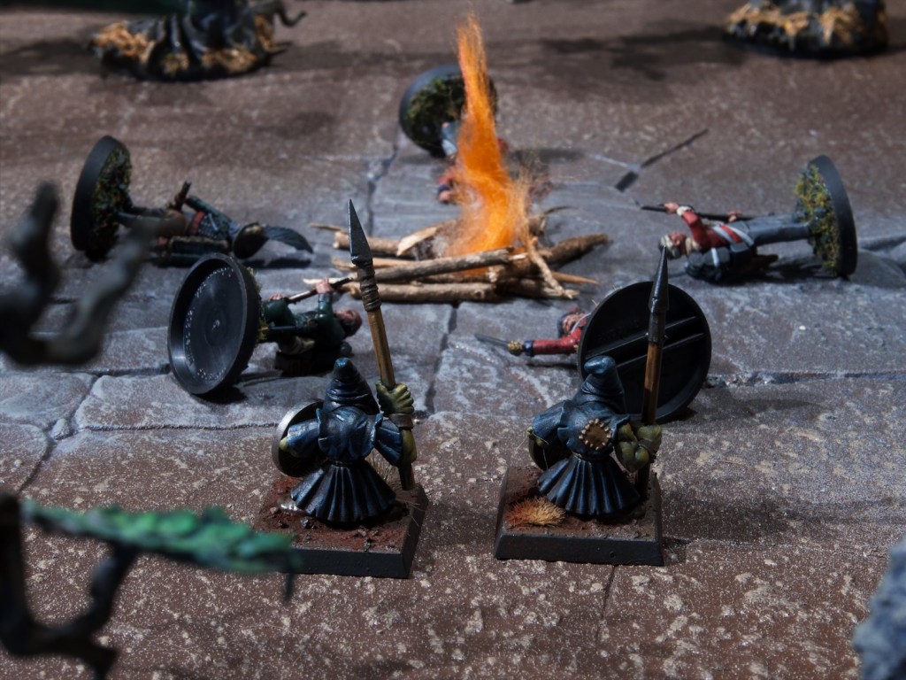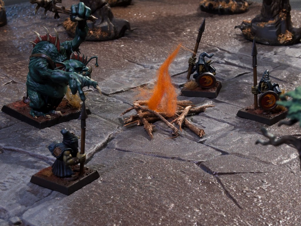 The scenario setup has two randomly selected sentries standing guard while the rest of the unit is asleep around a campfire. There are four clue markers set up close to the outside of the table, two of which have goblins close to them with a further two goblins appearing at two randomly selected table corners. The sleeping figures need to roll each turn to see if they wake, or if a monster attacks them they automatically wake. Either way once a figure wakes it gains fatigue tokens which negatively affect its defense and melee ability for the turn.