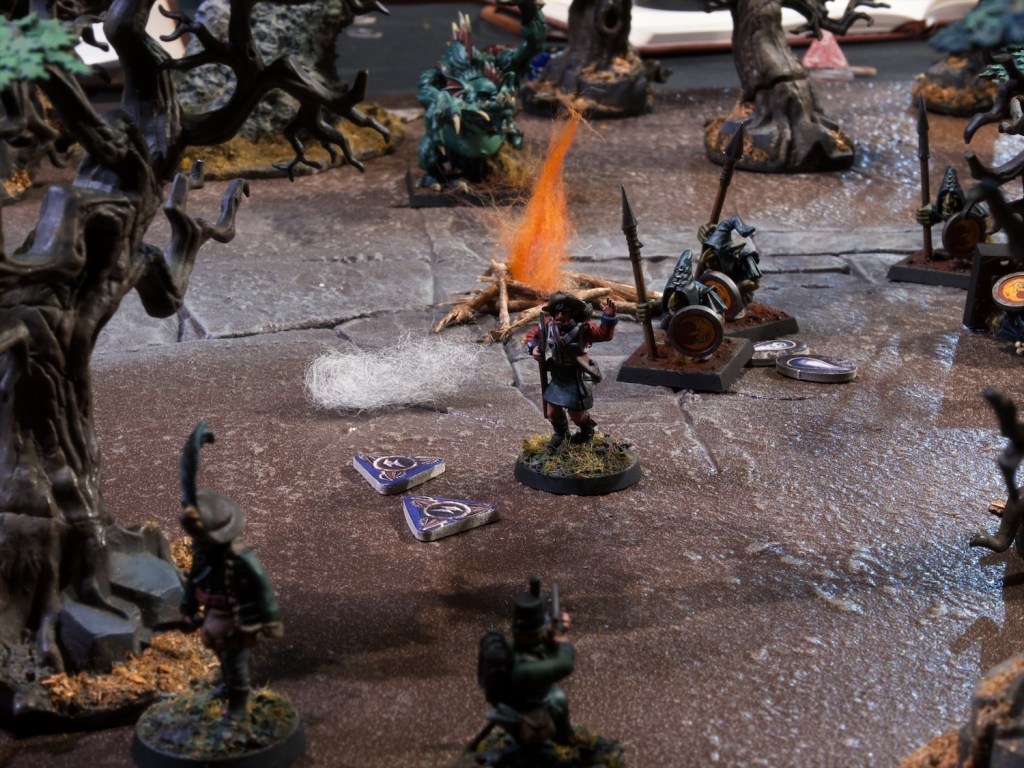 MacPherson runs to the rescue of the Lieutenant and Crowe, charging the closest goblin. His attack misses, but so does his opponent’s strike back. Crowe is one of the only models in posession of cold iron shot so I really need him to be able to fire which he cannot do if he’s close to them due to their disruptive aura. For that reason he moves back and takes a shot but misses. The Lieutenant then dives in the gap and takes on Crowe’s attackers. He misses and so does the goblin.