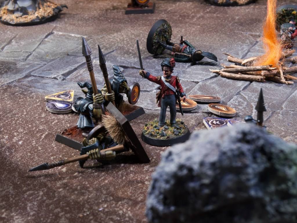 The goblin on MacPherson attacks, misses (those bagpipes!) and MacPherson misses right back. MacRae is in for a bloodier fight: the first goblin attacks, hits him for low damage, and MacRae’s strike back kills the goblin (after I spend my skill die re-roll). The second goblin hits him, dealing 10 damage, which would take MacRae out! I spend my second power die to reduce the damage – this keeps MacRae in the game. MacRae scores a solid hit back. The third goblin also hits MacRae and this time it’s too much for the brave Lieutenant and he collapses. The last goblin charges the Major, waking him by scoring a solid hit. The Major tries to strike back but misses, still bleary-eyed.
