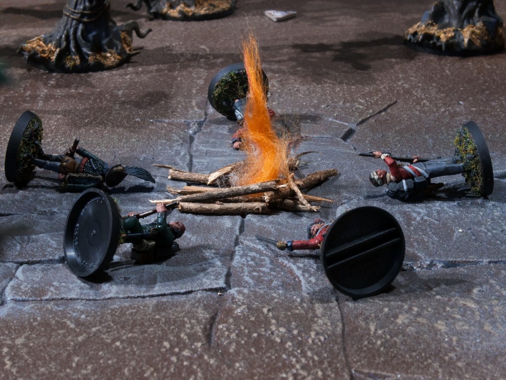 I didn’t have a campfire model on hand, so some twigs from the garden and some orange wool from Bolt Action vehicle damage markers did the trick!