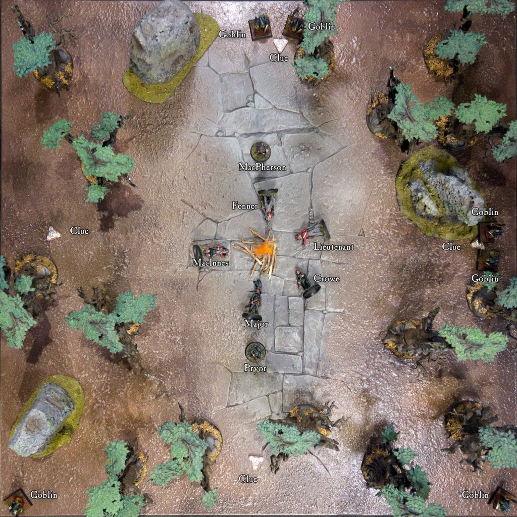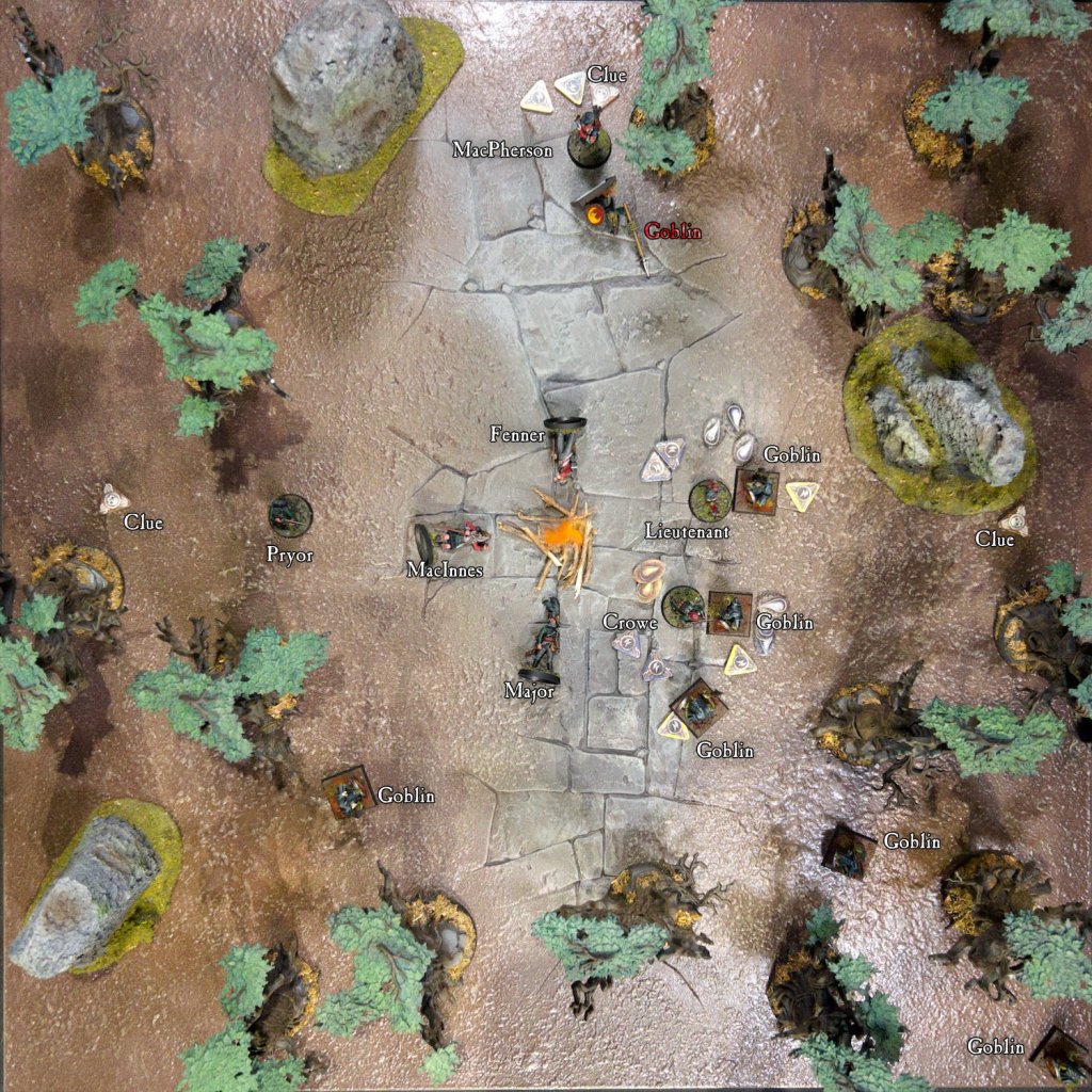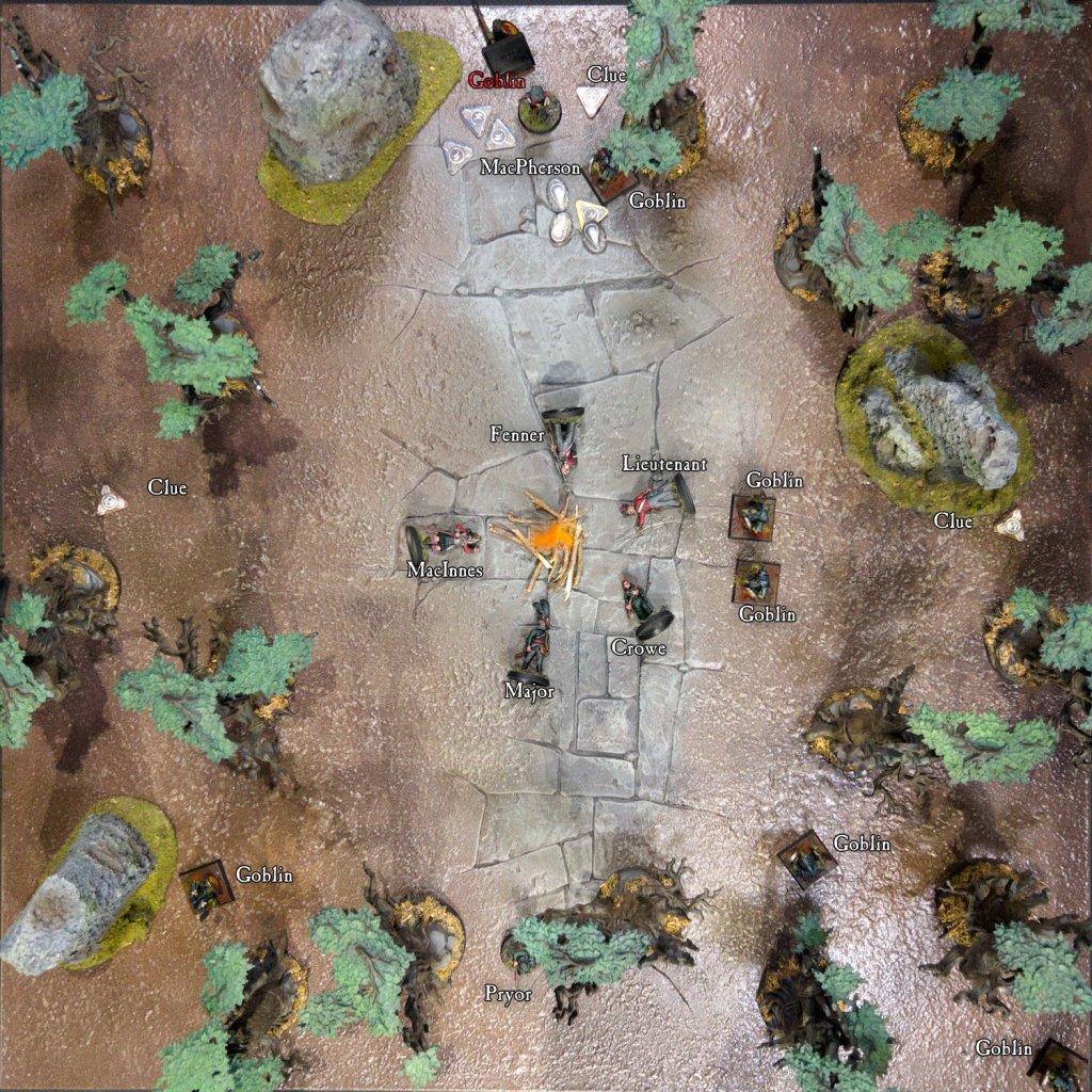 Pryor investigates the clue he was moving towards last turn and finds some nice dry wood which he lights up, never know when something will need to be set on fire! Fenner finally wakes up and moves to investigate the clue to the north. He finds a bag of iron nails that he promptly loads into his musket. The Major moves away from his attacker and fires his rifle at it, hitting and heavily wounding the goblin. MacInnes sleeps on.