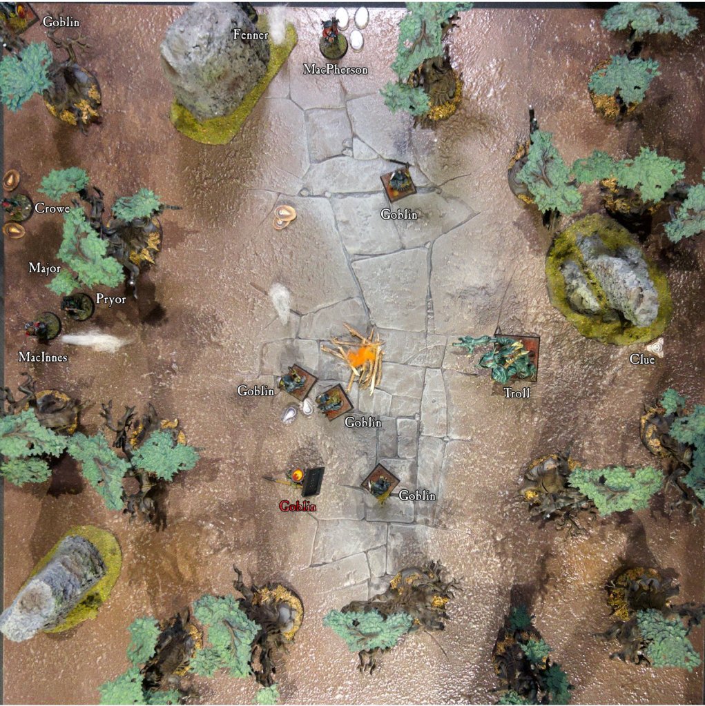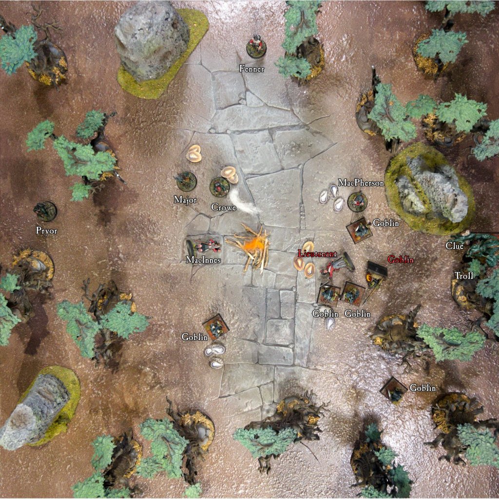 MacPherson sprints away from the goblins. Crowe walks away and reload his rifle with some cold iron shot. The Major does a quick reload and fires at the closest goblin but misses. He then also moves away. Most goblins are now out of range of attacking anyone so they just follow the unit members. One goblin is in range of MacInness and rushes him, waking him up with a close miss. MacInnes reads the room and moves back rather than attacking back. The troll approaches the campfire, picks up a rock and throws it but misses.