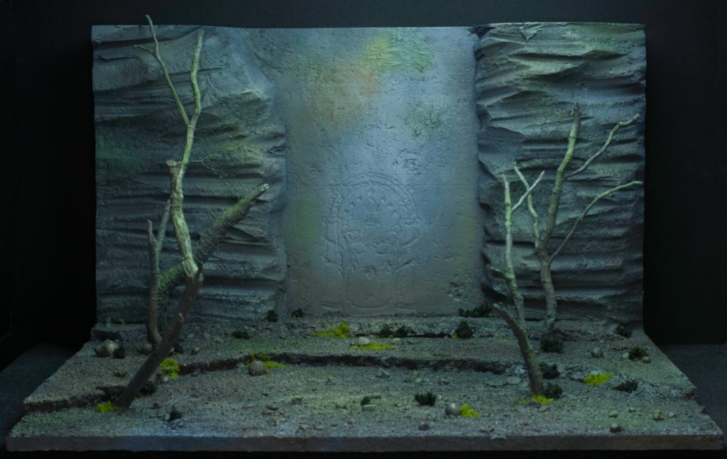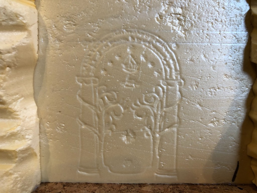 The door itself was carved into the rock by tracing a printout of the door with a pen. By pushing hard enough and using a ball point I was able to leave an impression of the door into the foam without tearing the paper.