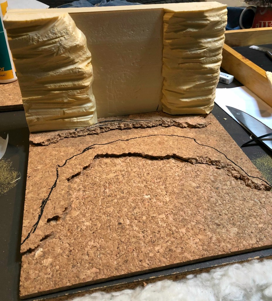 The construction was relatively straightforward, I used cork tiles to make the floor sections, layering them to add some height. The rock wall was made from XPS foam, which is quite easy to carve. The rocky pillars were cut with a hot wire cutter, and all of the surface was textured with a ball of aluminium foil.