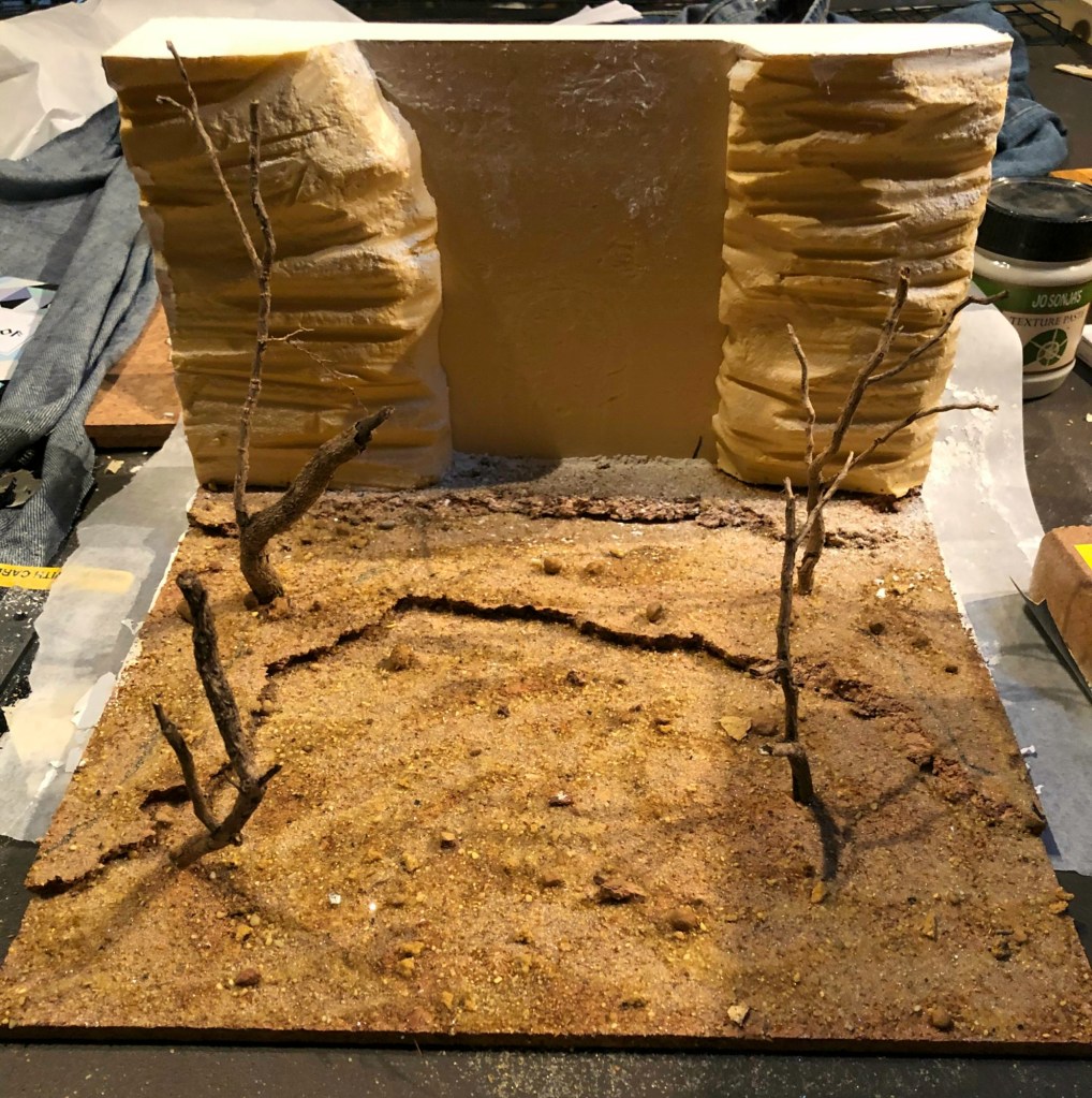 I then misted the trees with some Vallejo Khaki, to differentiate them from the rocks a bit, and added the same bits of foam as on the models bases to add a bit of vegetation.