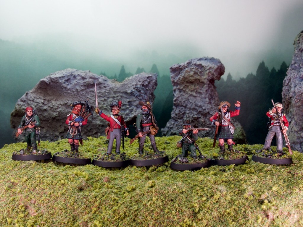 I bought a bunch of different Napoleonic sprues a while back to use for Chosen Men so I had plenty of models to turn into a Silver Bayonet unit. As you can see above I ended up with 7 models rather than the max 8, so a slightly elite unit composed of my officer, a junior officer, two highlanders, two riflemen, and an infantryman. This eclectic mix is pretty standard for these units, which are made of soldiers (and others!) that have survived encounters with the supernatural rather than any particular regimental affiliations. The officer and the riflemen are based on the Wargames Atlantic Riflemen kit, the highlanders and junior officer on the Victrix highlanders kit, and the infantryman is from a Perry Miniatures kit. I decided early on I wanted to minimise the amount of shakos in the models, I see these units as being on the road a lot and being in full battle-dress for these skirmish fights doesn’t seem very appropriate (plus I could see losing your hat very easily when running away from a Werewolf!).