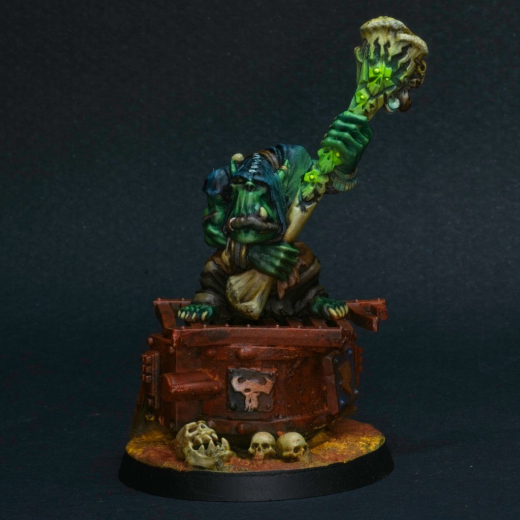 I wanted to keep the model as is even though I was planning on using him as a 40k ork, so to make sure he fit in with the rest of my force, I used the base to cement him in the universe. This also had the added benefit of making the model taller, which is appropriate since this model is tiny compared to the current Weirdboy model.
