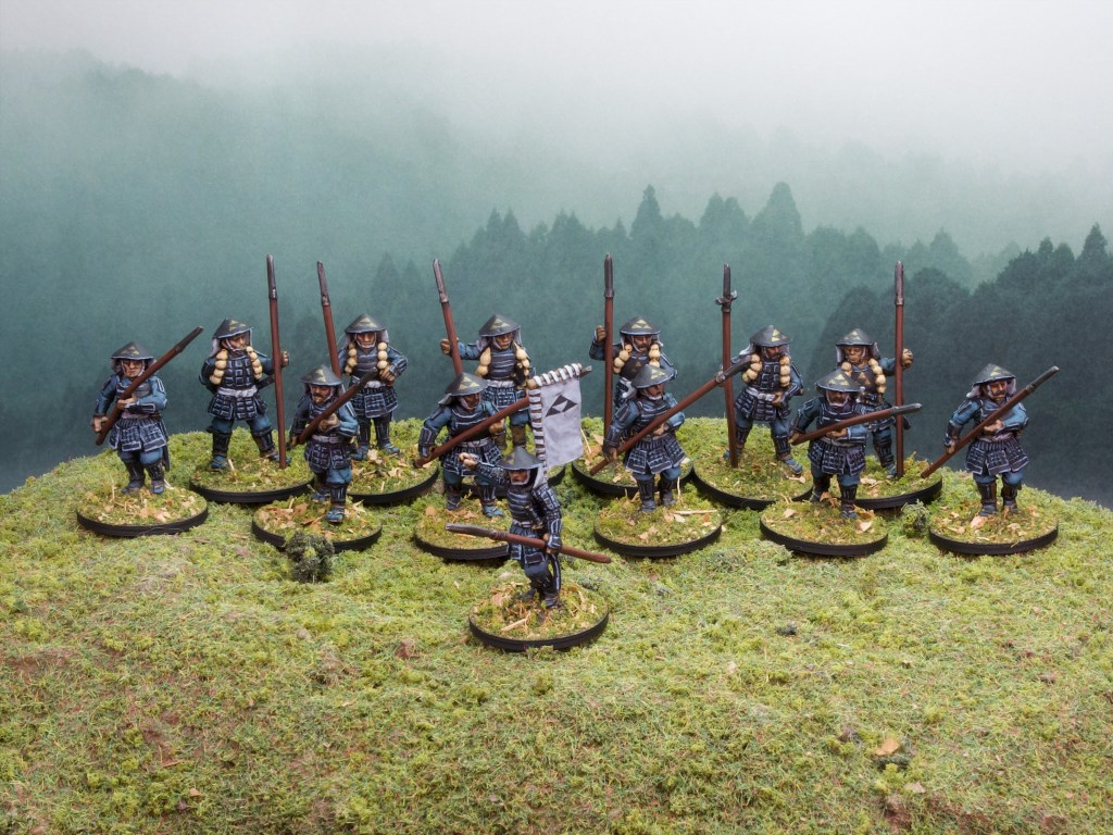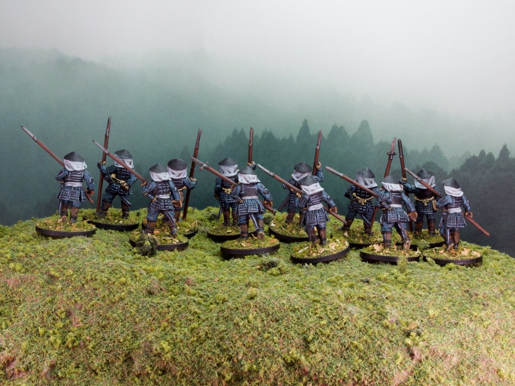 If you’re familiar with the period you might have recognised the mon (emblem) of Clan Hōjō, with it’s three triangles (representing fish scales if I understand rightly!). I decided to go with this clan as I visited some the region they ruled over during my first visit to Japan back in 2015 and really liked it, it’s one of my fondest memories from that trip. In fact the foggy forest photo I’ve been using as a backdrop to my miniature photos for quite a while now was taken there! So the backdrop is very appropriate for these models.
